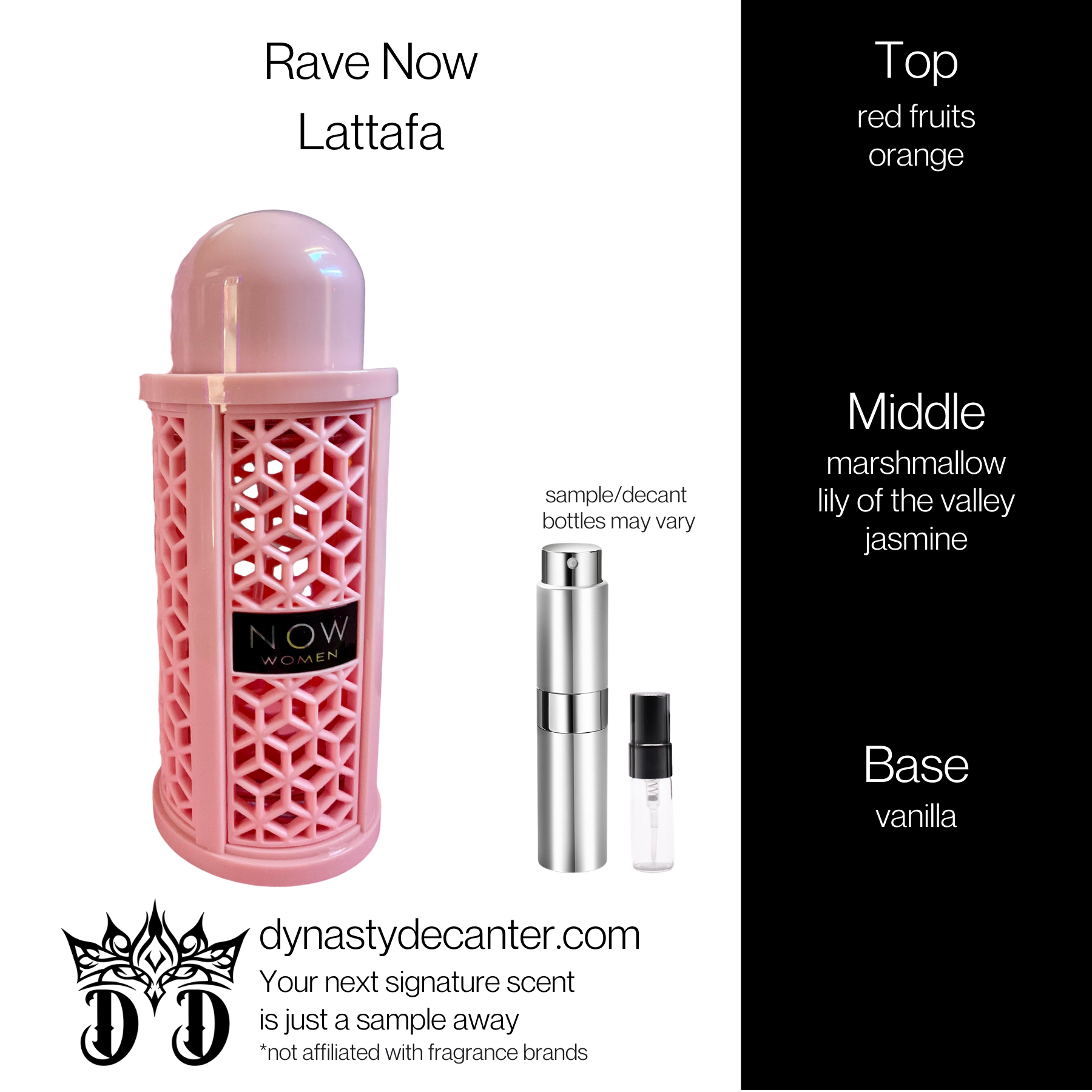 Rave Now Women by Lattafa is a bright, sweet, and plush vanilla-gourmand fragrance perfect for day or evening wear.