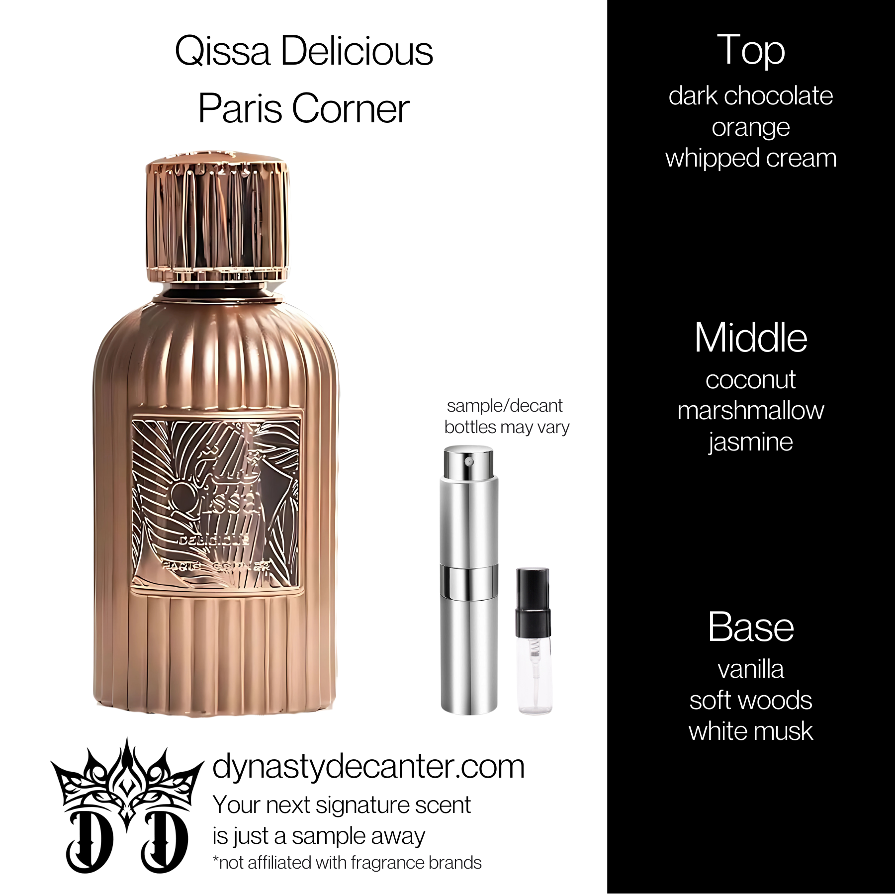 This scent is a decadent journey, opening with a bold embrace of dark chocolate, sharp yet smooth, instantly brightened by a flash of sun ripened orange. A cloud of whipped cream softens the entrance, guiding you into the heart where tropical sweetness blooms. Here, the air is thick with the scent of sun warmed coconut and pillowy marshmallow, given an unexpected floral elegance by a whisper of jasmine. As the fragrance settles, it melts into a comforting foundation of creamy vanilla, grounded by the quiet strength of soft woods, leaving a lasting, tender echo of white musk that feels like a second skin. Wearing this is like draping yourself in a velvet cape of gourmand indulgence, a sweet, rich warmth that is both playful and deeply comforting.